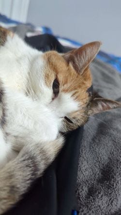 So, in addition to daily food and water. Aki needs subcutaneous fluids three times a week. However, she is really well behaved and will let you give them to her just laying in your lap. She’ll wait for you lift your leg before heading back to her bed for a nap.