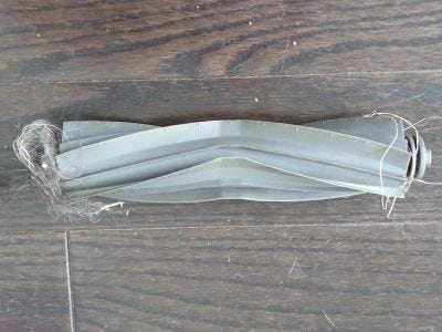 Second, as we just mentioned, Frank should be checked for hairballs. Remove the roller and clean it out. This is a week without cleaning. (My story is we failed to clean it during the week, so you could see what it looked like.) In the Chaos Critter Demesne, most of the buildup is around the ends of the roller’s axle.