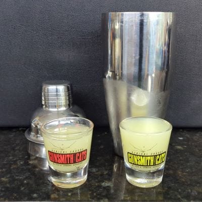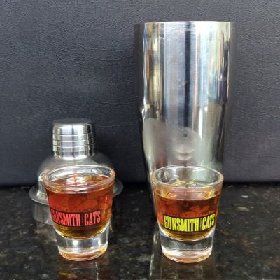 Then add two ounces of cognac or brandy to the mixer. Notice the fancy Gunsmith Cats (a Kenichi Sonoda manga and anime) shot glasses we use for measuring.