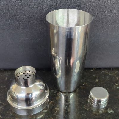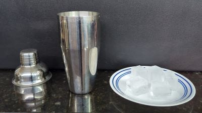 The stainless steel mixer comes in three parts. In the center of the picture is the large metal “glass” into which the ice and liquids go. To right is the press-on cap. To the left is the press-on lid.