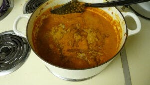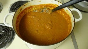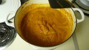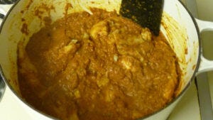 Now we add the vindaloo paste from the food processor to the pot with the protein. We cook the paste to get rid of the raw taste from the uncooked spices. (When you taste spices that haven’t been simmered or toasted, you often get a bitter flavor. If spices have sat for years they will have a bland flavor. With newer spices the heating can draw out the oils that give them their best flavor. This is part of the reason why buying and then immediately using a spice works best. ~Anna)
