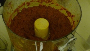 Add the onions to the serrano/ginger mix and start the food processer. Slowly add the spice mix, until the mixture is smooth, without large lumps of serrano or ginger.