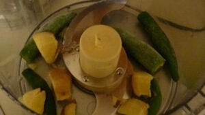 Run the serrano peppers and ginger through the food processers. With peppers like serranoes and jalapenos, the more curved the pepper, the spicier it is. We use serranoes because the actual Indian peppers aren’t readily sourced, and the serranoes add freshness and hotness without changing the flavor otherwise.