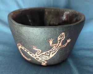 We were social again this weekend and had over my science-father and his wonderful talented wife. She made us a really cute bowl – which has lizards on it! It is like a Fluffy inspired bowl! (Fluffy is our crested gecko.)