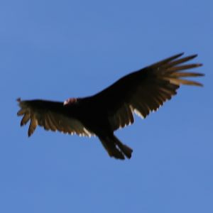 Life and death are both part of running a ranch. I got this picture of a turkey vulture flying overhead. The vulture’s red head, from which it gets its name, can just be made out in the picture.