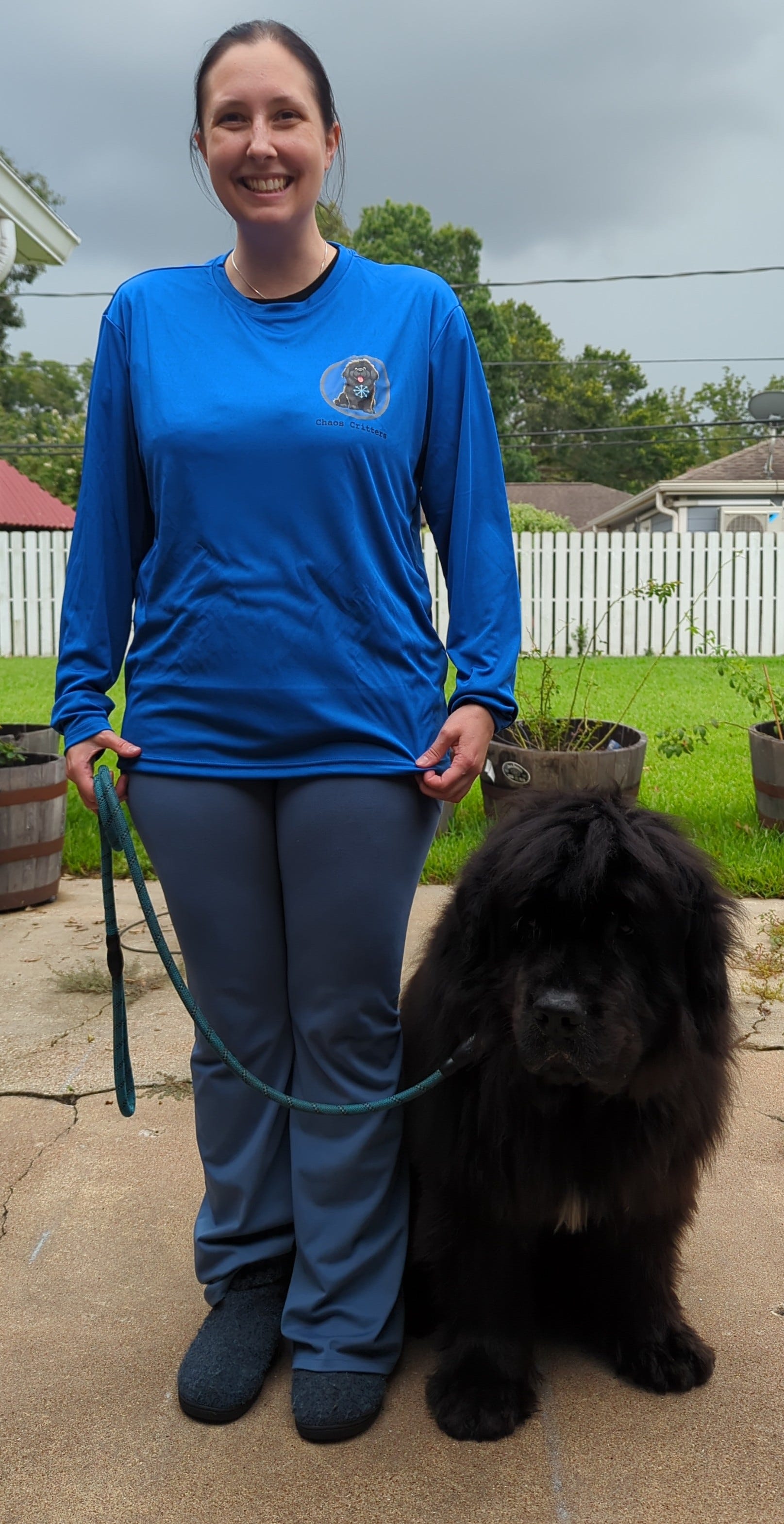The front has a small chaos critters logo with the our Newfie and cyan chaos symbol.