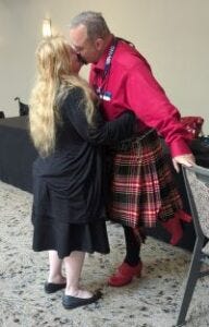 At breakfast the first day, we met Greg Gagnon and Cathy Gagnon ( https://www.facebook.com/greg.gagnon.cissp ). Greg, an author, also wears kilts, which distracts people from seeing his wife’s matching outfit. They are wonderfully fun people! Greg gave me insight to pass to another author. They were an awesome introduction to the con for Anna. We have a picture of Greg and Cathy kissing. (I am still so confused taking pictures of other people… I have a hard time with pictures, which is part of why we mostly have Newfie and cat pictures. ~Anna)
