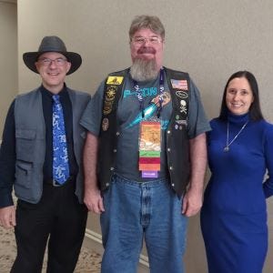 Later Tom Tinney ( https://www.tomtinney.com/ ) was on several panels. He was an awesome panelist and a cool moderator. It was cool seeing a motorcycle guy on the panels. And even cooler having someone there taller than me – he reminded me of one of the two main people that taught me Aikido. We not only got a picture of him. He took the one of Anna and I. (Meep! Pictures, I hope my soul is still intact. ~Anna)