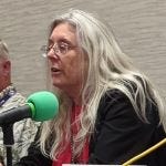 Last, but not least is Jane Lindskold, the fantasy guest of honor and her husband Jim Moore. ( https://janelindskold.com/ ) Jane is an author and Jim is an archeologist. I think we could talk to both for days. I think Anna could talk to both of them about graduate school for ages too. (Sorry, Jim, it was a writer’s con, so Jane got all our attention.) Jane was our other favorite moderator. Jane was kind to attendees (including us) and firm (with panelists and attendees) when she needed to be. She is truly a smart, organized, classy lady! Pictures of both Jane and Jim. Jim is under one of the strangest room occupancy signs – not sure if you could get 100 people in there.